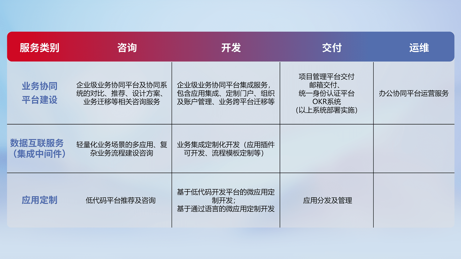针对钉钉、、企微、、、、IDaas等平台级产品提供产品的规划、、方案、、、、交付、、、定制化开发等服务,,,,实现如统一协同办公、、智能客户服务、、、、混合会议管理、、、智能数据查询、、、等业务场景,,,,实现数字化转型。。。