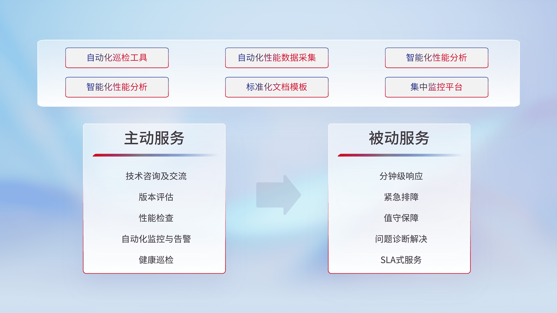 智能化工具和标准化文档,,,,保障服务质量,,,提供主动服务(包含技术咨询、、版本评估、、、、性能检查、、自动化监控与告警、、、健康巡检)和被动服务包含(分钟级响应、、紧急排障、、、、值守保障、、问题诊断解决、、SLA服务)。。